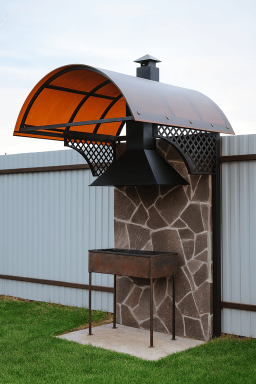 - Размер и форма: навес под мангальную зону изготавливается по индивидуальным размерам — цена зависит от масштаба и особенностей размещения.